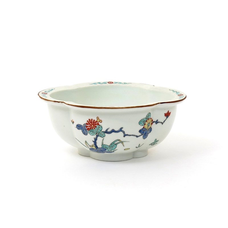 A Chantilly-style quatrefoil bowl 19th century, decorated in the Kakiemon palette with prunus and other sprays of Oriental flowers around scattered insects, red hunting horn mark, 17.5cm across.