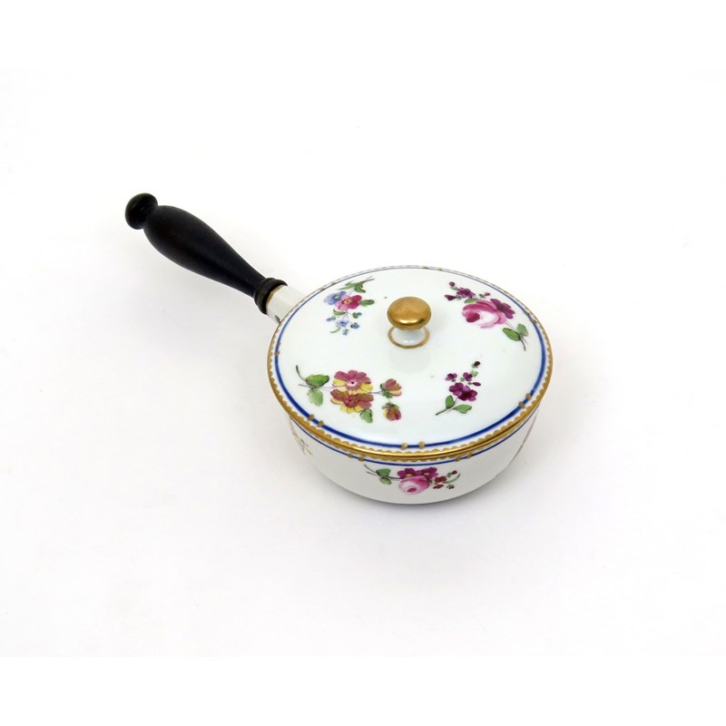 A Sèvres-style saucepan or warming pot and cover late 18th/early 19th century, the flattened circular body painted with sprays of flowers within a blue and gilt rim, fitted with a turned wooden handle, interlaced LL mark, painter's and initial marks in blue, 18.3cm. (2)