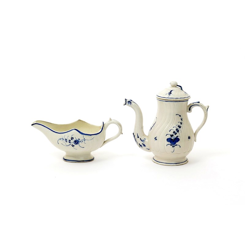 A Septfontaines (Boch) creamware coffee pot and cover late 18th century, and a sauceboat, the spiral-moulded forms simply decorated with naive sprays of Oriental flowers in blue, the sauceboat with an impressed Boch Luxembourg mark, some damages and repairs, 21.5cm max. (3)