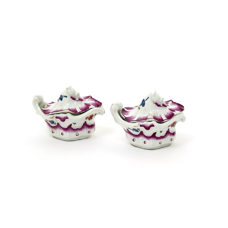 Two Vienna small boxes and covers c.1760-70, the rococo scrolled forms highlighted with feathered puce decoration and painted with scattered European flowers, impressed shield and P marks, some damages, 9.2cm across. (4)