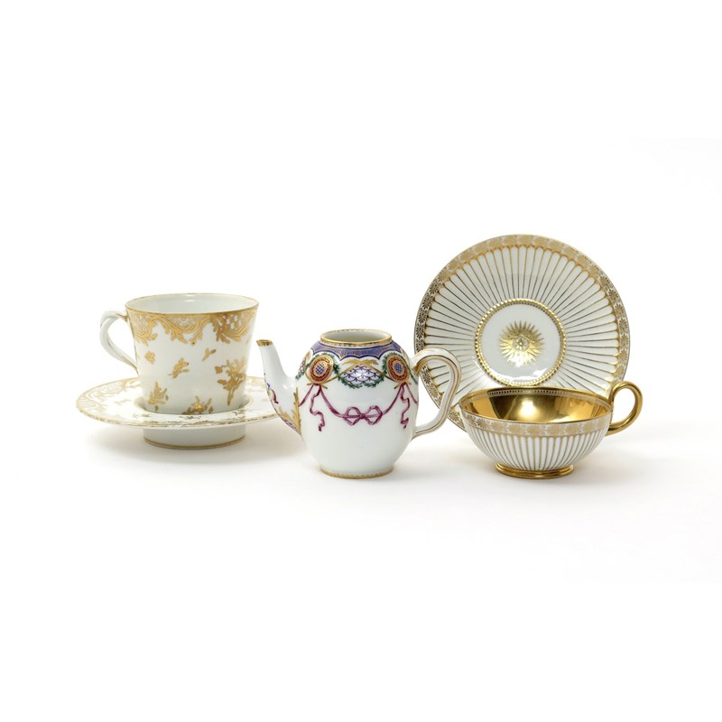 Two Sèvres cups and saucers 18th and 19th centuries, the earlier of gobelet a la Reine shape with a deep trembleuse saucer, decorated with gilt flower sprays and a formal border, the other of reeded form with a gilt anthemion border, and a small Sèvres teapot of ovoid form, richly decorated with puce ribbon suspended from roundels and leaf swags, covers lacking, 15.8cm max. (5)