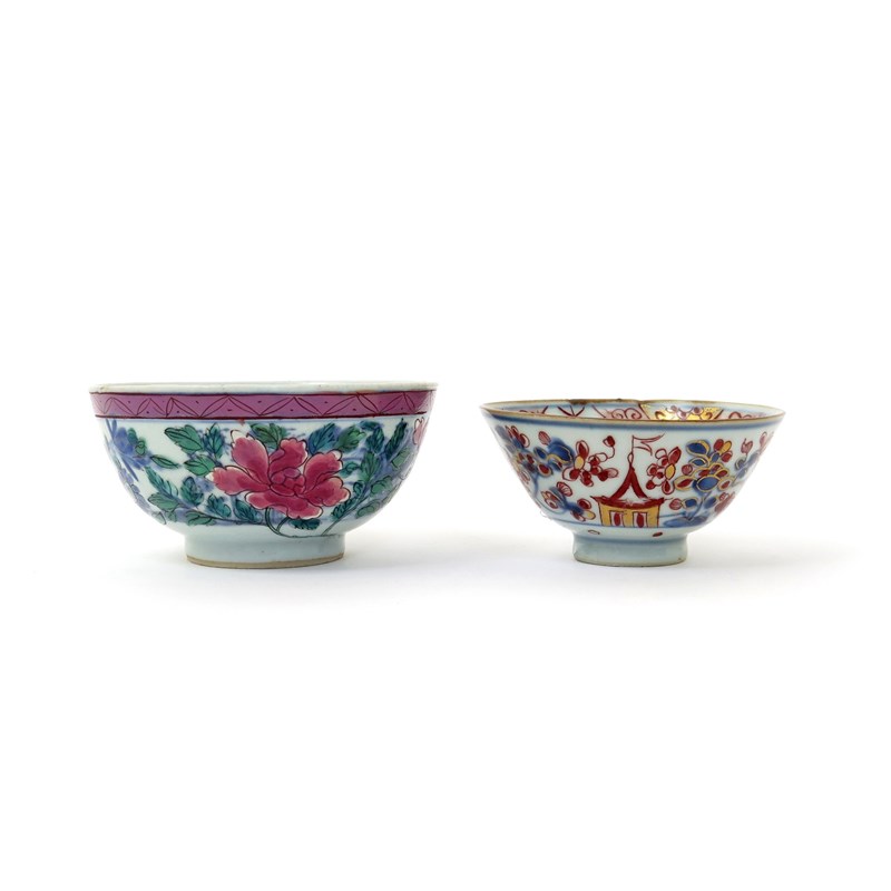 Two English-decorated Chinese porcelain bowls 18th century, the larger originally painted in underglaze blue and later enamelled with flowering peony branches, the smaller with later highlighted decoration in red and gilt, 11.3cm max. (2)