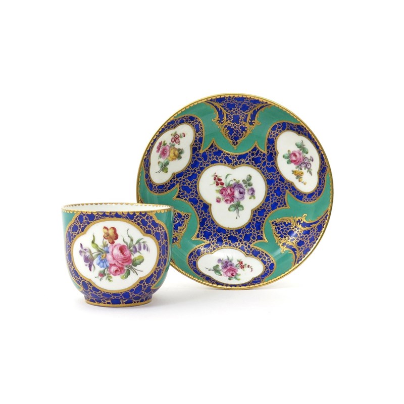 A Sèvres coffee cup and saucer date code for 1758-59, painted with panels of roses and other European flowers reserved in quatrefoil cartouches on a blue caillouté ground with green borders, interlaced LL and F marks, four dot painter's mark, 13.6cm. (2)