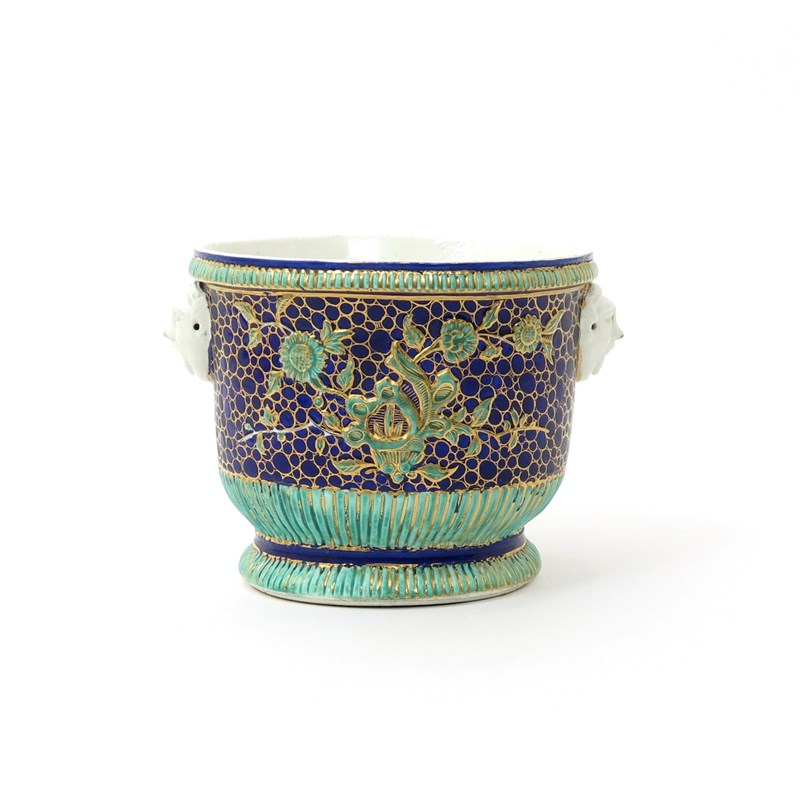 A Saint Cloud seau à bouteille or wine cooler c.1722-40, the rounded body moulded to two sides with flowering branches issuing from formal rockwork, the sides with grotesque mask handles with protruding tongues, the whole later decorated in turquoise enamels on a blue caillouté ground, incised SC over T mark, 15.8cm.