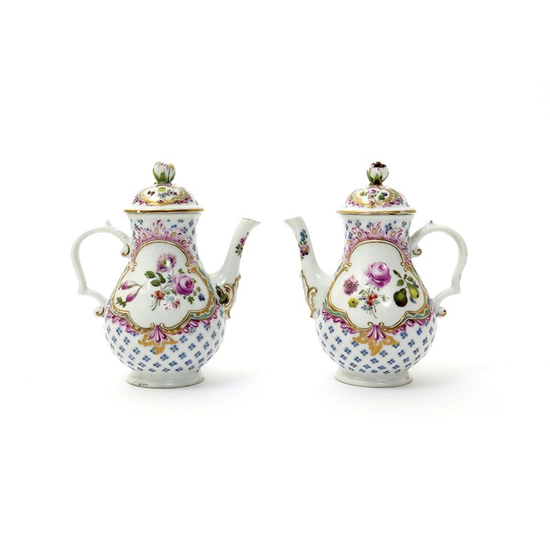 A pair of Meissen miniature coffee pots and covers mid 18th century, moulded with rococo panels on a hatched ground, painted with flowers and fruit on a ground of small stylized blue flowerheads, the domed covers with floral finials, blue crossed swords marks, some small chips, 11cm. (4)