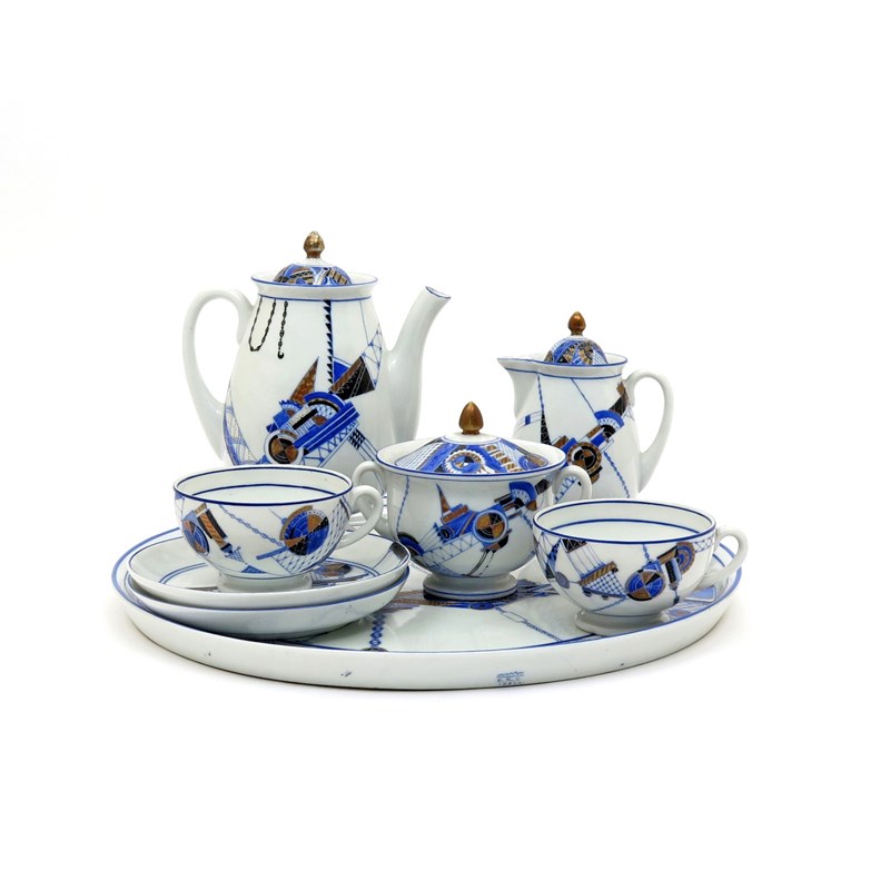 A Russian Soviet porcelain tête à tête service c.1931, Lomonosov Factory, richly decorated with an abstract pattern in blue, black and gilt on a white ground, signed for Alexandra Vladimirovna Riznich, blue EKS and wavy line marks. Comprising: a circular tray, a teapot and cover, a jug and cover, a sucrier and cover, two teacups and two saucers. (11)