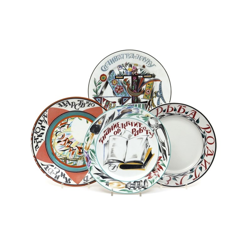 Four Russian porcelain plates with Soviet Propaganda designs 20th century, one originally designed by Rudolf Vilde with work instruments and flowers to the rim, the well with cyrillic script above books, translating to 'Knowledge Lightens Work', one designed by Sergei Chekhonin with a red inscription to the rim, one attributed to Pierre Ino with two children reading stop large patterned letters, the last by Chekhonin with five shaped panels of script to the rim, further colourful letters to the well, various marks, 25.5cm max. (4)