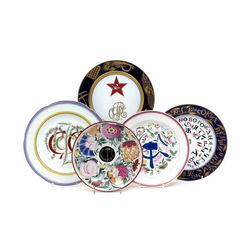 Five Russian porcelain plates with Soviet Propaganda designs 20th century, four after designs by Sergei Chekhonin, one copying a famous design of a hammer and sickle on a black roundel within a wide border of fruit and flowers, one with two red sickles around floral garlands, another with a central hammer and sickle surrounded by cyrillic letter, the last with a blue hammer and sickle on a floral ground, another plate originally designed by Mikhail Adamovich with a gilt monogram above a five-pointed star, the blue rim with gilded instruments of labour, various marks, 26.7cm max. (5)