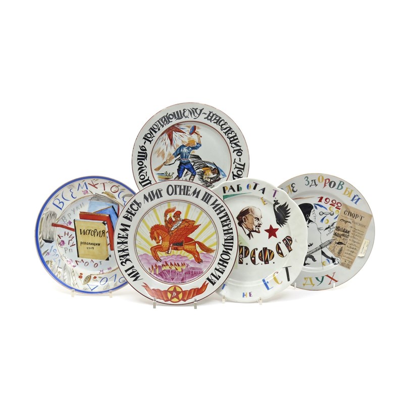 Five Russian porcelain plates with Soviet Propaganda designs 20th century