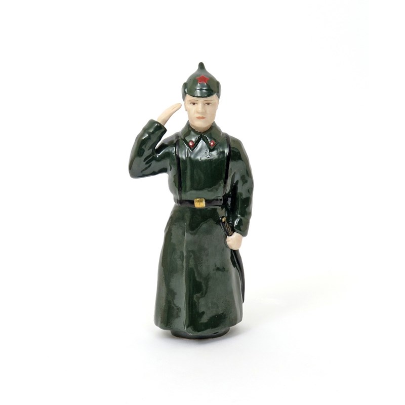 A Soviet Russian porcelain figure 20th century, of a Red Army soldier in full uniform, saluting with his right hand and holding a sword in his left, incised hammer and sickle mark, inscribed 1927 but probably later, 25cm.