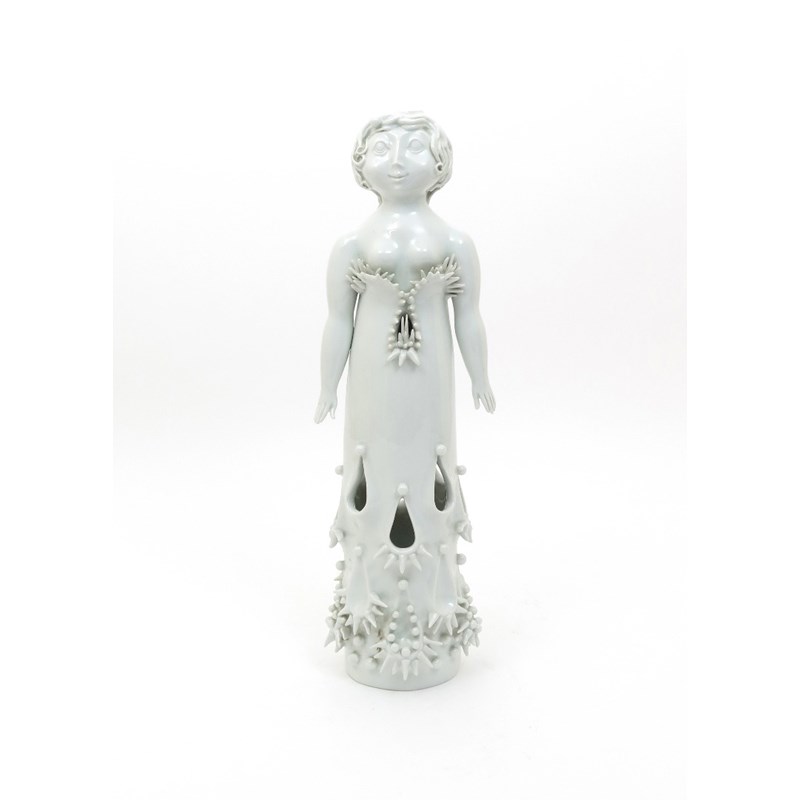 A large Meissen white-glazed vase figure of Flora c.1975, modelled as a girl standing with arms by her side, wearing a long shift dress, around the base pierced with teardrop holes, applied with small spikes and balls of clay, a round aperture at the top of her head, blue crossed swords and impressed Weiss marks, 51.5cm.