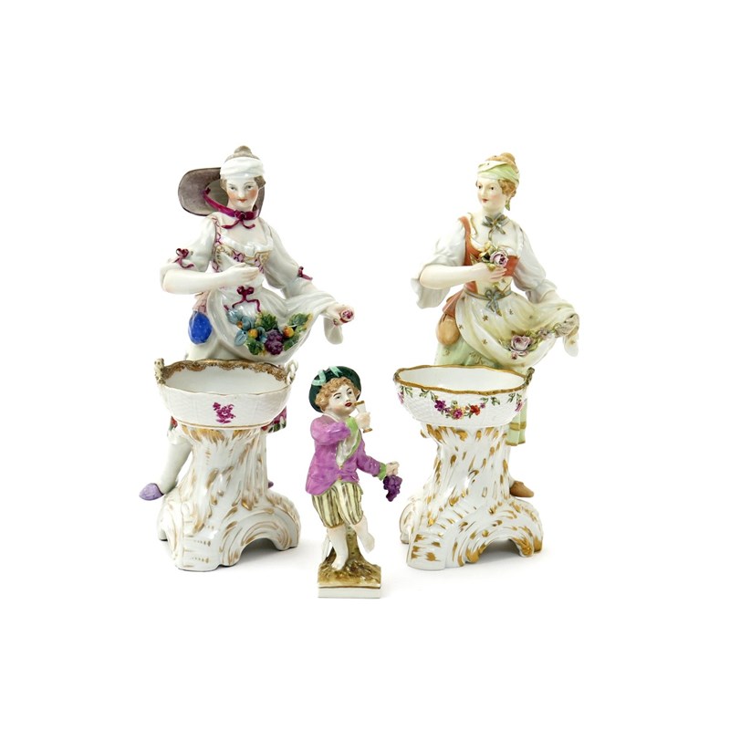 Two Berlin (KPM) sweetmeat figures 19th/20th century, each modelled as a maiden with flowers in her apron, standing before an oval basket painted with further flowers, raised on domed triangular bases, and a Berlin 'month' or 'zodiac' figure, of a boy holding a goblet of wine and a bunch of grapes, representing November or Scorpio, blue sceptre marks, red KPM and orb marks, some damages, 21.5cm max. (3)