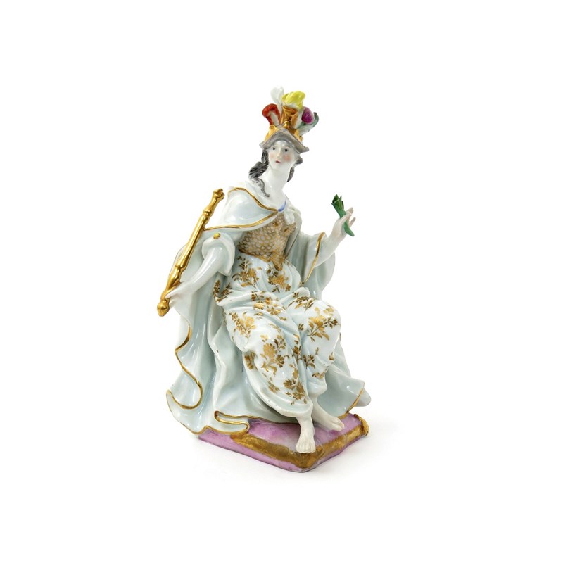 A Meissen figure of a female warrior 19th century, seated and holding a sceptre in her right hand, leaves in her left, wearing a tall plumed helmet, blue crossed swords mark, incised No. 1224, some restoration, 18.5cm.