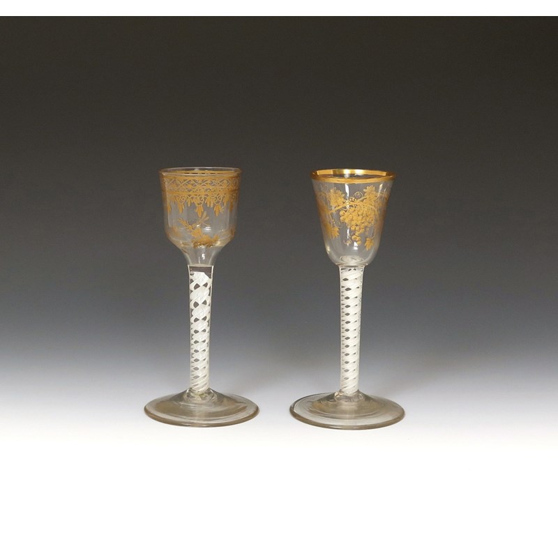 Two gilt-decorated wine glasses c.1760-70, one with a rounded funnel bowl decorated possibly in the Giles atelier with fruiting grapevine, the other with an ogee bowl gilded with flying insects and flower sprigs beneath a formal scroll and diaper border, both raised on double series opaque twist stems, 15cm max. (2)