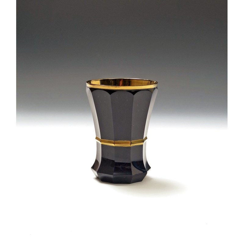A good Bohemian Lithyalin beaker c.1830, the flared and faceted form of a deep purple tone, with gilt collar and narrow band to the waist, 11cm.