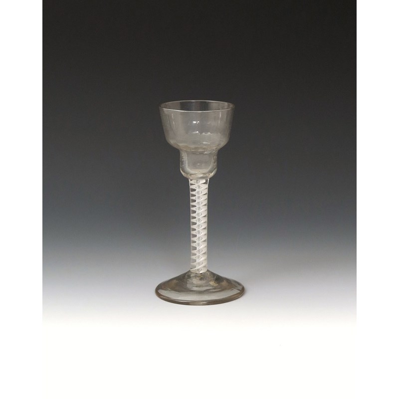 A pan-topped wine glass c.1755, the bowl moulded with vertical flutes, raised on a double series opaque twist stem above a conical foot, 14.3cm.