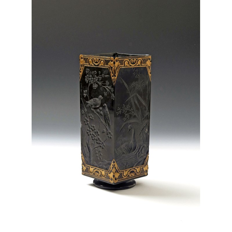 A French cut and gilded glass vase late 19th century, of square form and deep blue colour, cut in deep relief with a swan swimming amidst reeds to two sides, two birds perched in flowering prunus branches to the other two, the neck and foot cut with a stylized gilded design, raised on a low circular foot, 22cm.