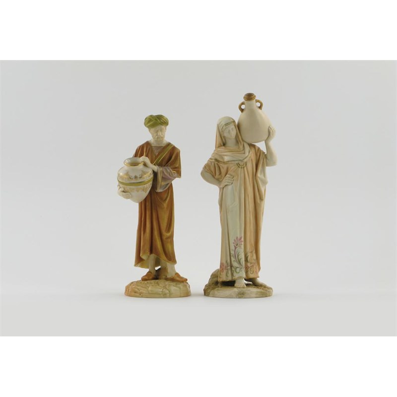 Two Royal Worcester figures of water carriers, gilded on a blush ground, various marks including date code for 1889, 25cm. (2)