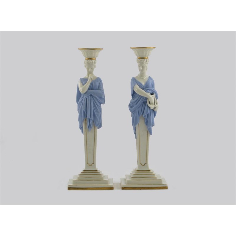 A pair of Royal Worcester candlesticks, modelled as Classical terms, draped in blue robes, raised on stepped bases, impressed marks and date codes for 1889, one with good restoration, 29.5cm. (2)