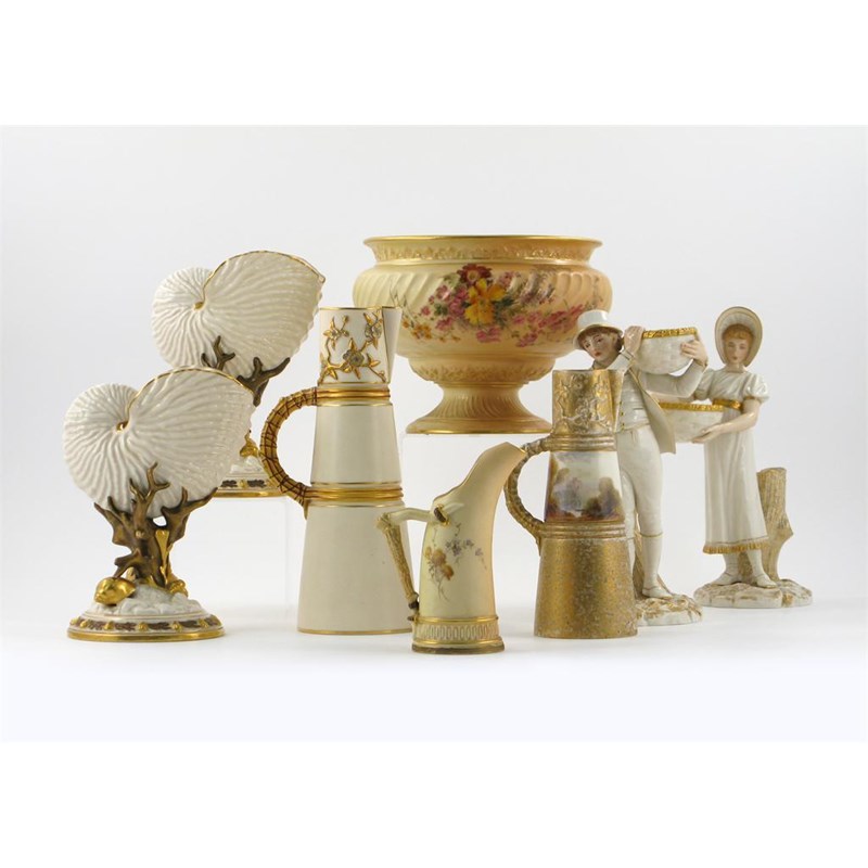 A pair of Royal Worcester sweetmeat figures, holding baskets before hollow tree trunks, a matched pair of nautilus shell vases, raised on circular rocky bases, three Royal Worcester jugs and a jardinière, various marks and date codes between 1882 and 1914, a small chip to one figure, 25.5cm max. (8)