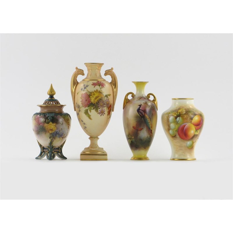 Four Royal Worcester vases, one with a cover and painted with flowers, one decorated with a peacock amongst autumnal foliage, one with peaches and grapes, various printed marks and date codes from 1896, a little restoration to one vase, 16.5cm. (5)