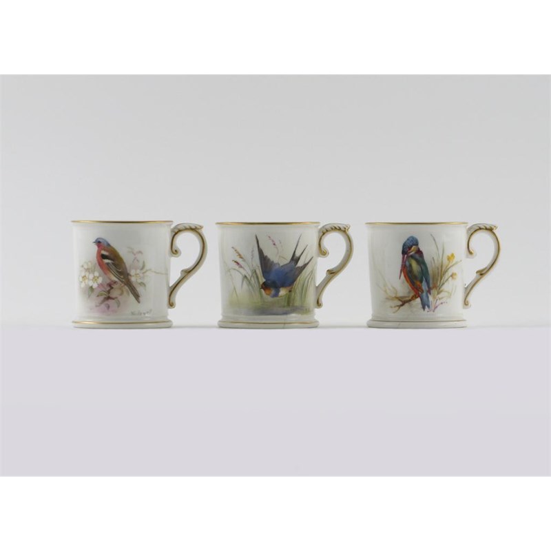 Three Royal Worcester ornithological small mugs, painted with a chaffinch, a swallow and kingfisher amidst suitable foliage, two signed 'W Powell', printed marks and date codes for 1911, base cracks, 8.8cm. (3)