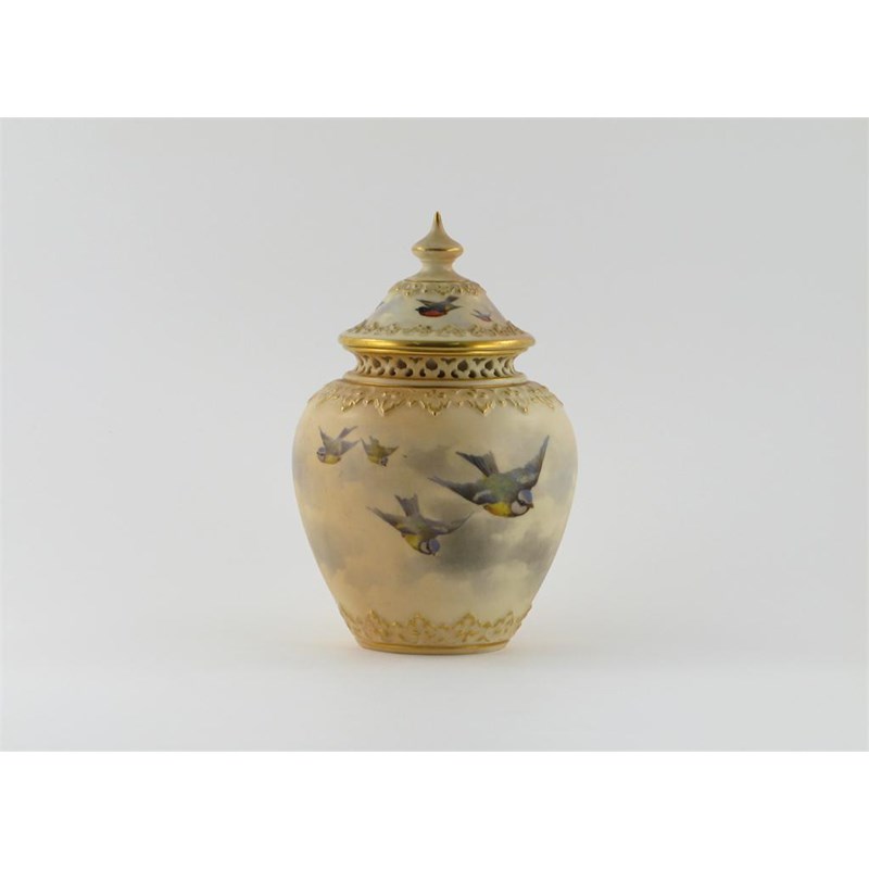 A Grainger Worcester pot pourri vase and cover, painted with six blue tits in flight on a blush ground, the neck rim lipped and reticulated, printed mark and date code for 1897, 20cm. (2)