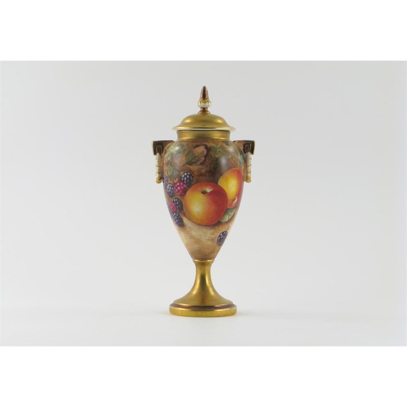 A Royal Worcester vase and cover, painted with apples, blackberries, peaches and grapes, signed 'P.Dines', printed black mark, a little restoration to the neck rim, 21cm. (2)