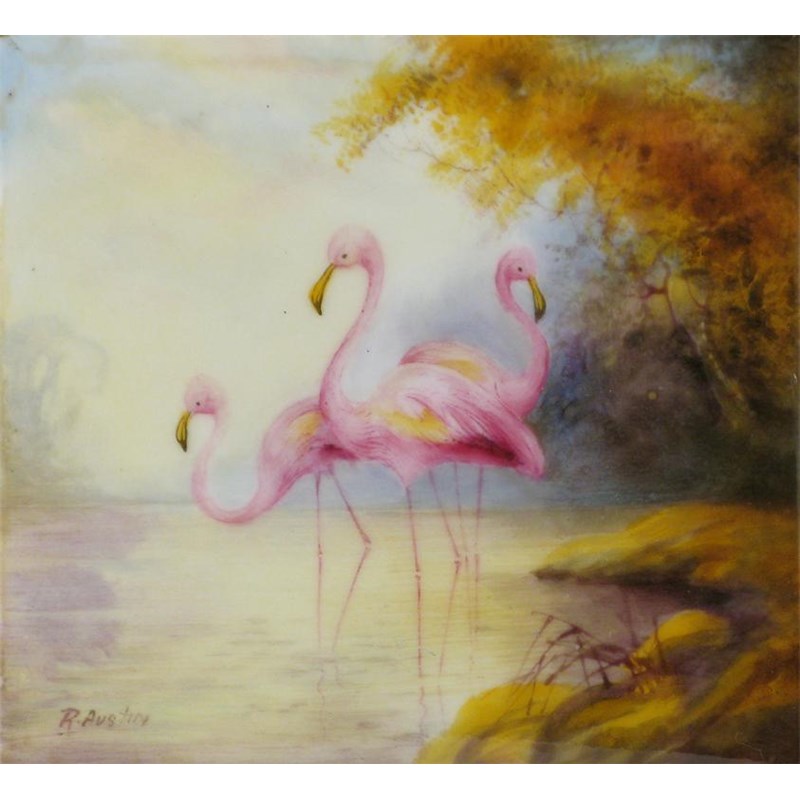 A Royal Worcester square porcelain plaque, painted with three flamingoes standing in still waters beneath an overhanging tree, signed 'R. Austin', a tiny chip to one corner, mounted in a veneered wooden frame, 8cm.