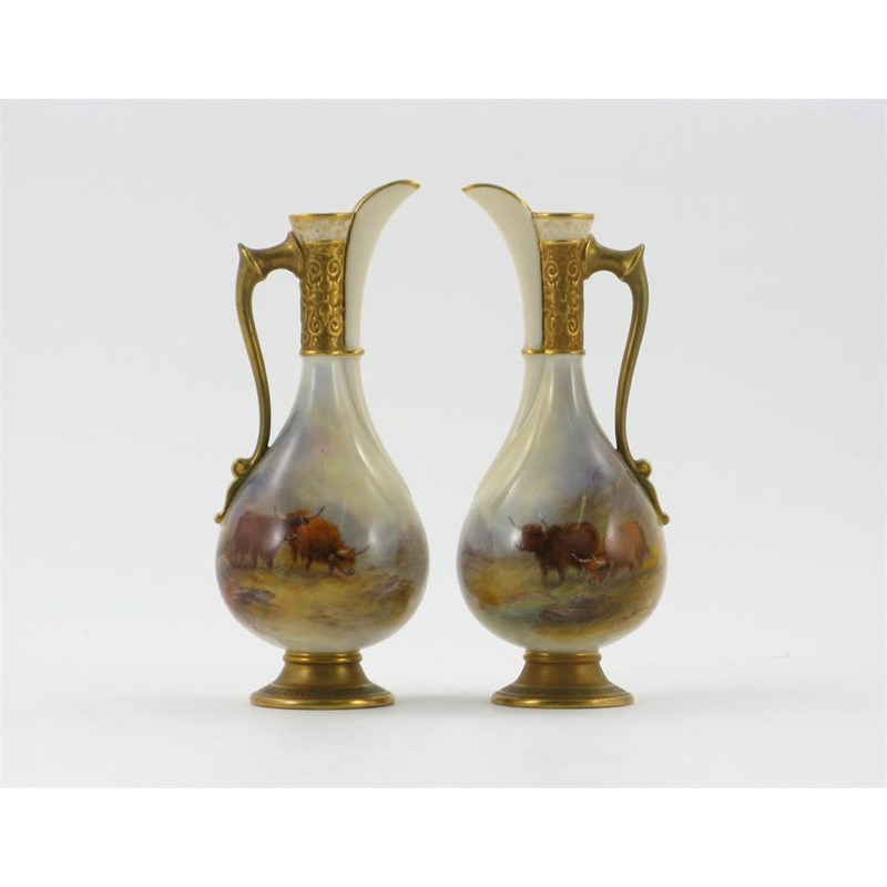 A pair of Royal Worcester small ewers, painted by Harry Stinton with Highland cattle in misty mountain landscapes, signed, the necks moulded with scrolling stylized floral decoration, shape 779, printed marks and date codes for 1913, 18cm. (2)