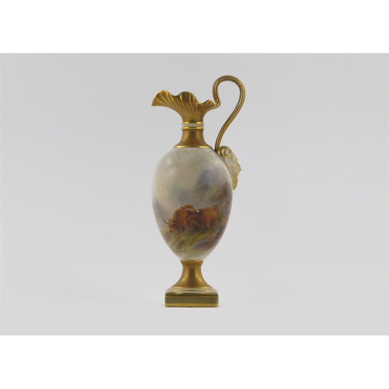 A small Royal Worcester ewer, painted by Harry Stinton with two Highland cattle in a heathland landscape, signed, the handle issuing from a horned mask, printed mark and date code for 1912, 16.5cm.