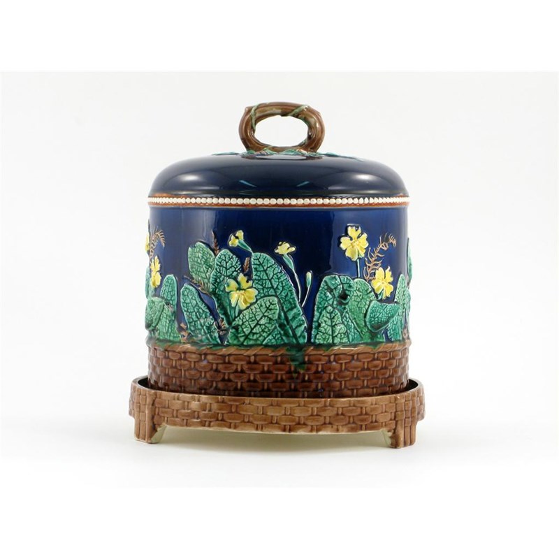 A Wedgwood Majolica cheese bell and stand, moulded with primroses above a basketweave border, the handle twined with ivy, impressed marks, 19th century, a few small chips, 27cm. (2)
