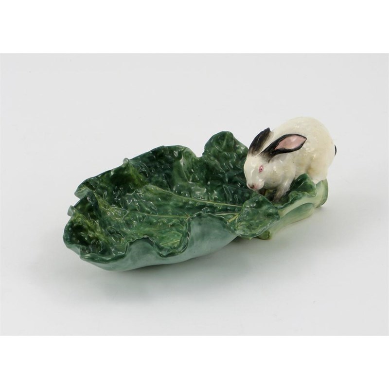 A Minton bone china dish, modelled as a large lettuce leaf, a small rabbit with black ears nibbling at one fold, various marks, c.1869, cracked, 22.6cm.