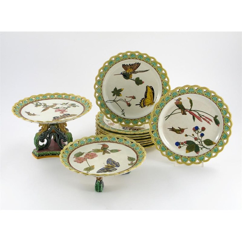 A Wedgwood creamware part service, decorated with long-billed birds, large butterflies and flower stems, within a shaped reticulated border, impressed marks, late 19th century, a few minor damages, 23.3cm. Comprising: a high tazza, a low tazza and nine plates. (11)