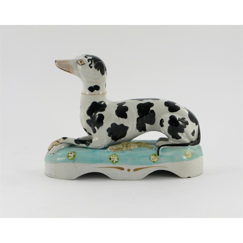 A Staffordshire model of a greyhound, recumbent on a light blue base with crossed forelegs, a dead hare by its side, 19th century, a flat chip to the base, one forepaw broken and restored, 27cm.
