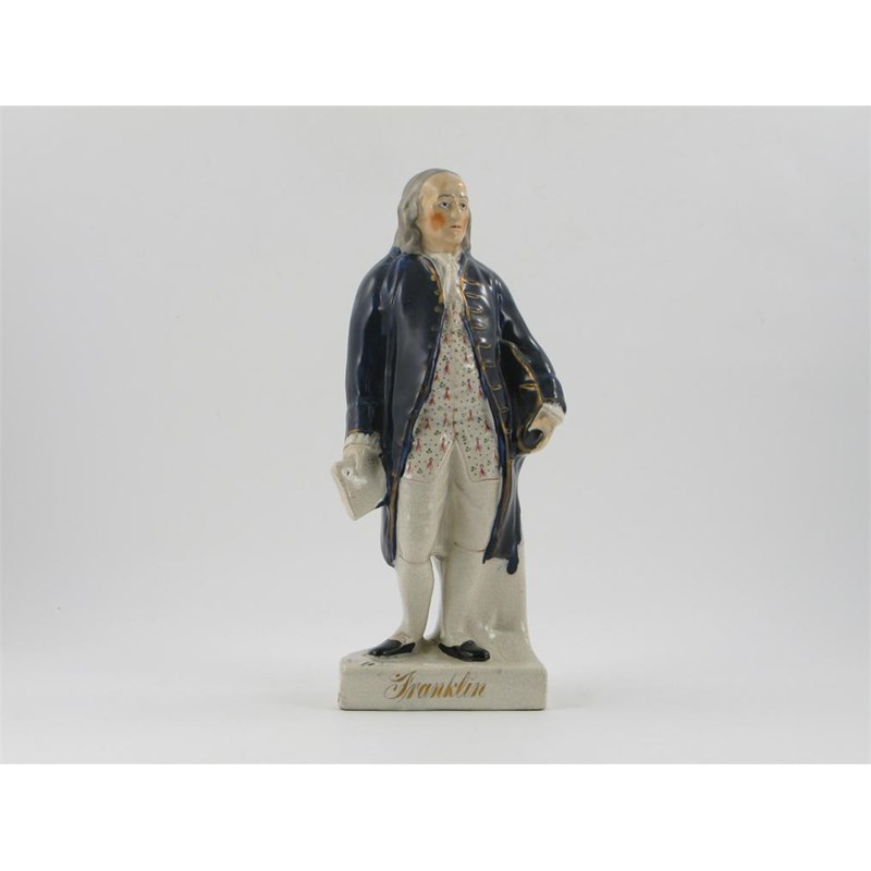 A Staffordshire model of Benjamin Franklin, standing and holding his tricorn hat in his left hand, a document in his right, titled to the base, 19th century, 37.5cm.