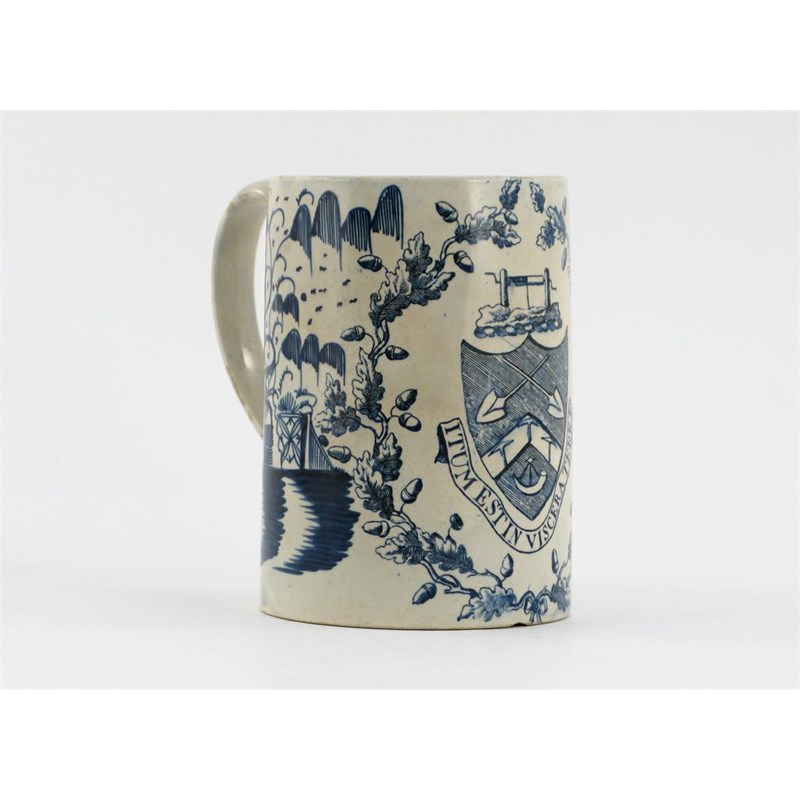 A rare and large pearlware blue and white mug, printed with a coat of arms and the motto "Itum Est in Viscera Terrae", within a border of oak branches laden with acorns, an Oriental landscape either side, c.1800, a flat footrim chip to the base, 15.5cm.
