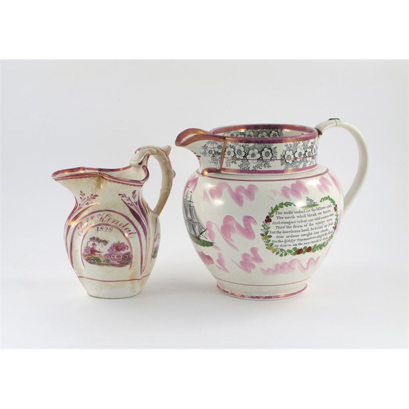 A dated Sunderland lustre ware jug, inscribed 'Rich d Wilson' and 'Sol r Kendal 1828', and a large pearlware shipping jug splashed with pink lustre and bearing two verses, small cracks, one handle broken and riveted, 30.1cm max. (2)
