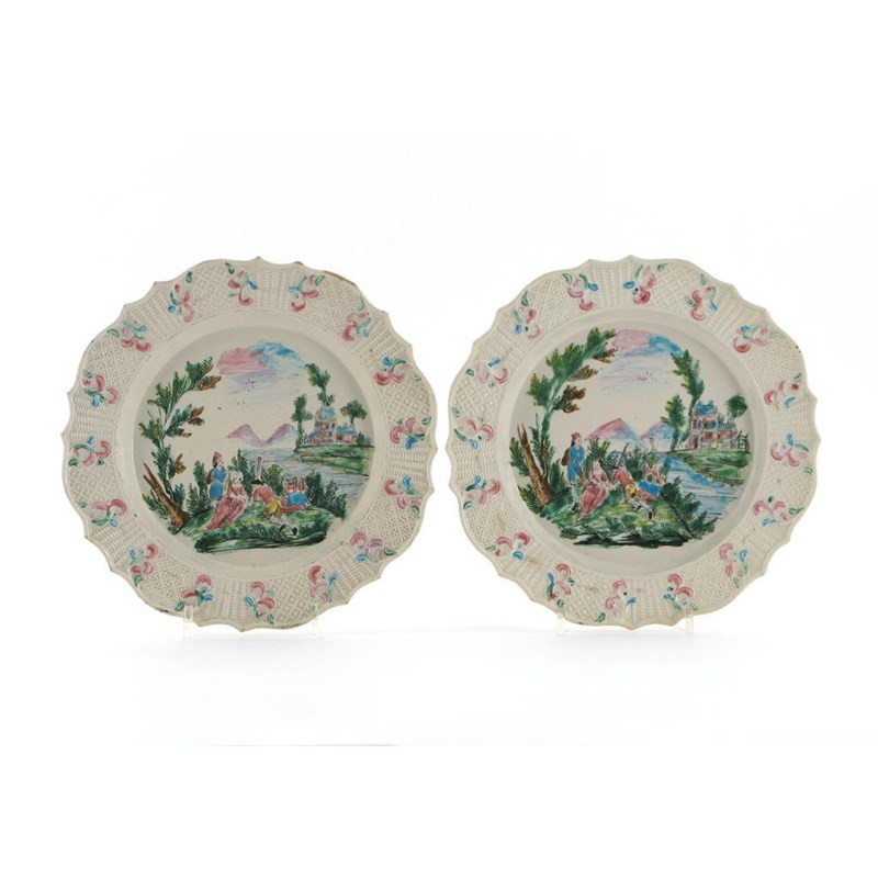 A pair of salt-glazed plates, painted in polychrome enamels with three figures on a grassy knoll beside a river, within osier and diamond moulded borders, c.1780, 22.2cm. (2)