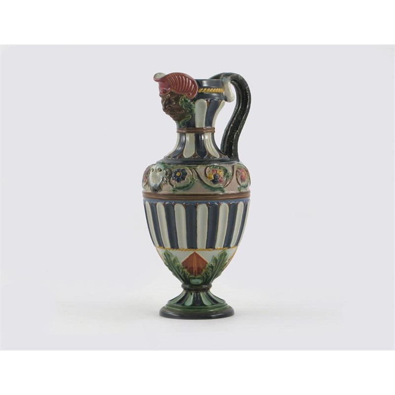 A Majolica ewer, the spout moulded as a heavily moustachioed face, the handle as horns issuing from a ram mask, impressed marks, 2nd half 19th century, 31cm.