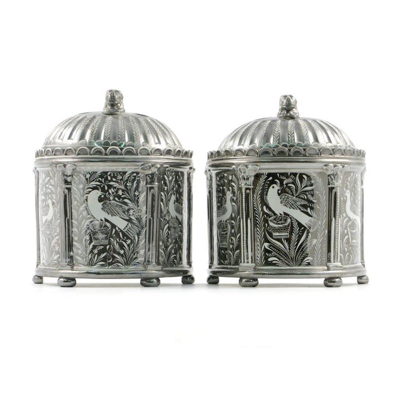 A pair of silver lustre bough pots and covers, each decorated in silver resist with three panels of a bird standing upon a flowerpot, separated by Corinthian columns, the covers each pierced with three circular holes and mounted by a lion's head, early 19th century, restoration to both covers, 24cm. (4)
