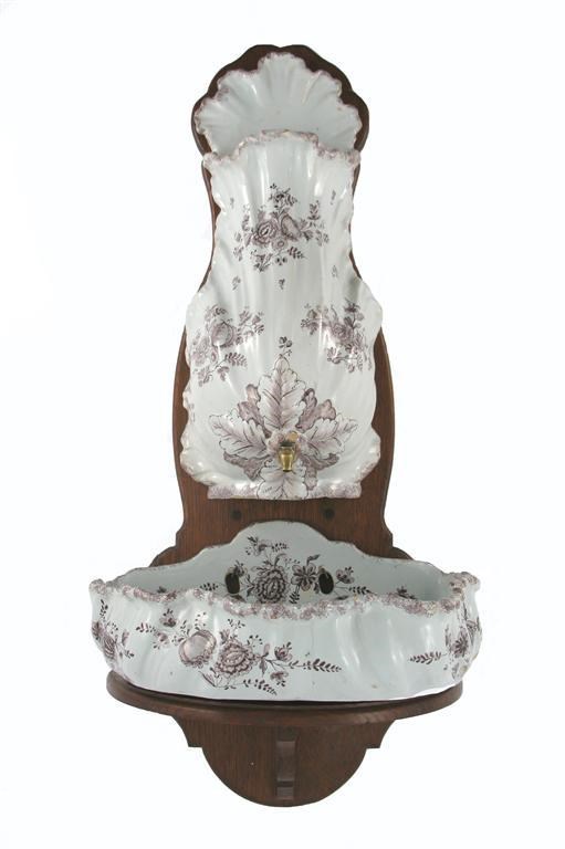 A Delftware water cistern and basin, painted in manganese with sprays of flowers, mounted on a modern wooden stand, 18th/19th century, minor damages and restoration, 84.5cm. (3)
