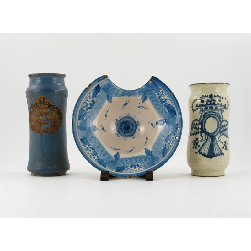 A Continental tin-glazed albarello, painted with two birds, back to back beneath a crown, a blue-glazed albarello, and a tin-glazed barber's bowl, painted with a garlanded border and stylized leaves, 18th and 19th centuries, some damages, 27.5cm max. Together with a wood stand. (4)