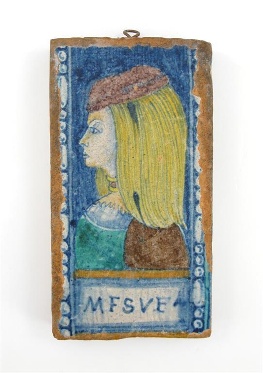 An Italian Renaissance pottery rectangular tile, painted with a profile portrait of a lady, possibly Francesca Sforza of Rome, 15th / 16th century, 17.7cm.