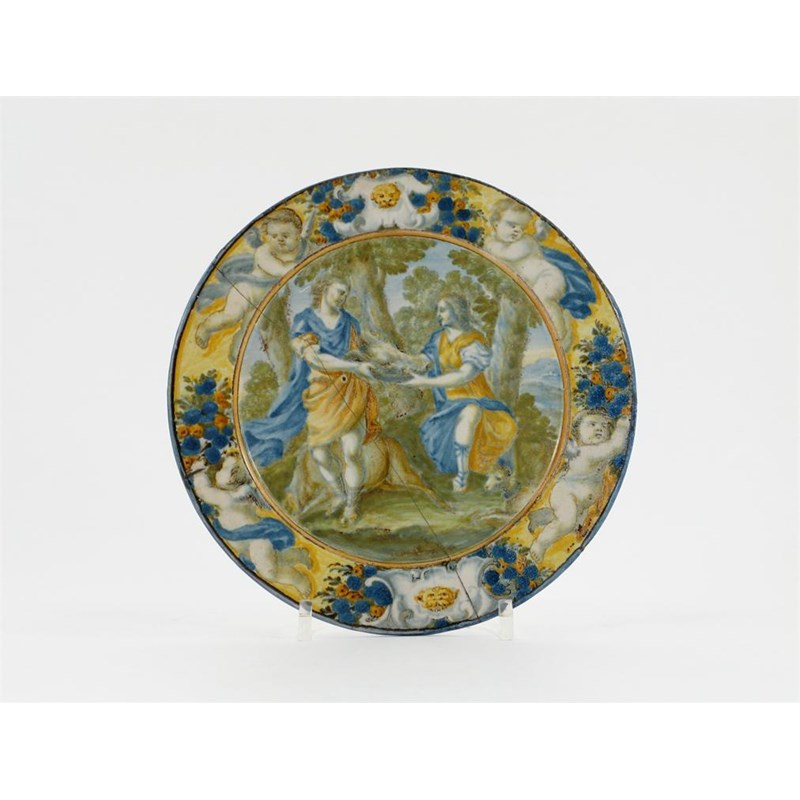 An Italian Castelli maiolica small plate, painted with Diana receiving the head of a boar, recently slain, the border with putti and flower bunches, broken and repaired, 18cm.