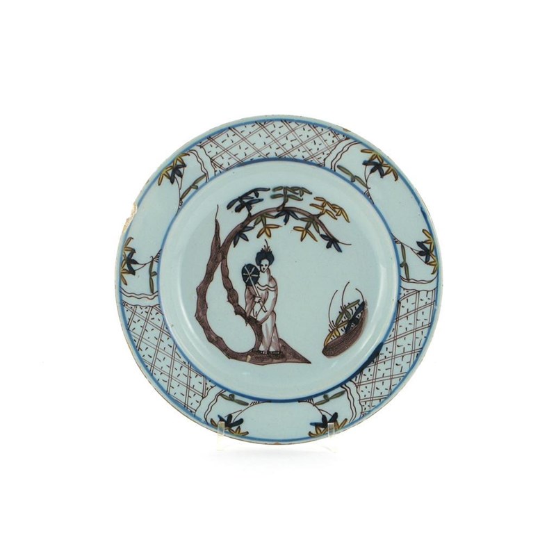 A Bristol Delftware polychrome plate, painted in shades of blue, green, yellow and manganese with an Oriental lady seated on a branch of a tree, holding a flat fan, within a hatched and bamboo border, c.1760, a 2cm rim chip, 22.5cm.