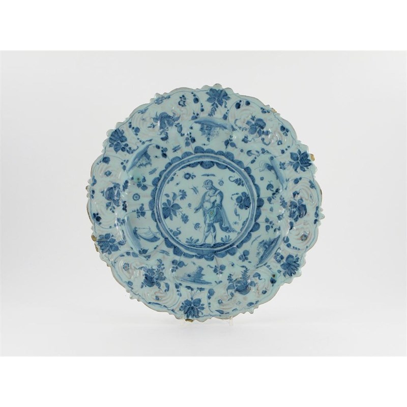 A Continental faïence moulded charger, painted with a centurion within shaped panels containing castles, sailing vessels and stylized foliage, painted mark to the reverse, cracked, 38.2cm.