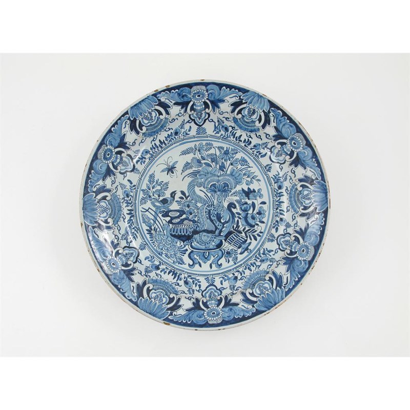 A large blue and white Delft dish, tightly painted with a mythical beast, birds and insects amongst trailing vases of flowers, within a bold stylized foliate border, painted mark for the Star factory, 18th century, a little wear, 35cm.