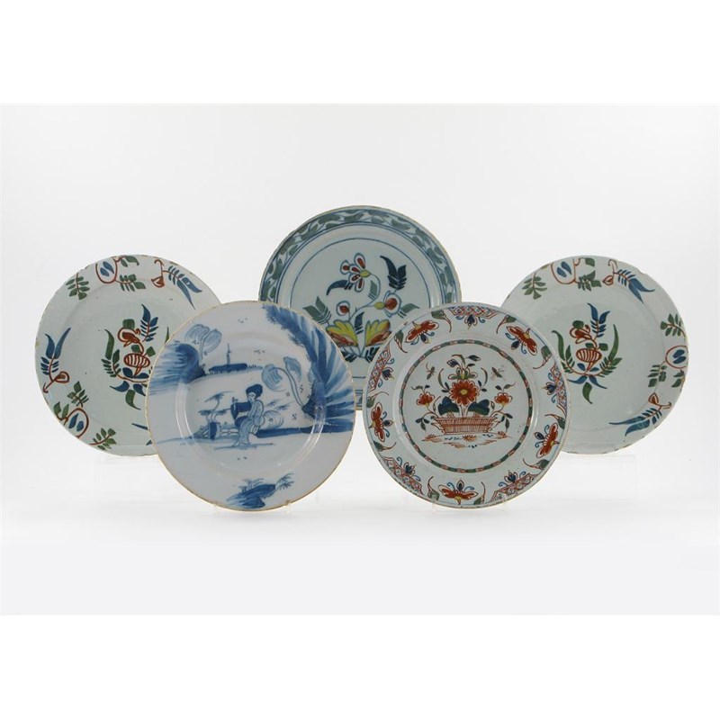Four Delftware plates, painted in shades of green, iron red, blue and yellow, with floral arrangements, and a blue and white plate decorated with a seated Oriental lady, 18th century, rim chips and frits, 22.3cm max. (5)