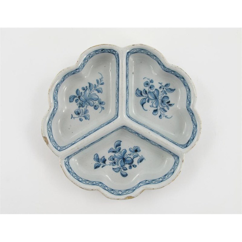 A Delftware blue and white sweetmeat dish, divided into three segments, each painted with a floral spray within a hatched border, 18th century, small glaze frits to the rim, 17.5cm.